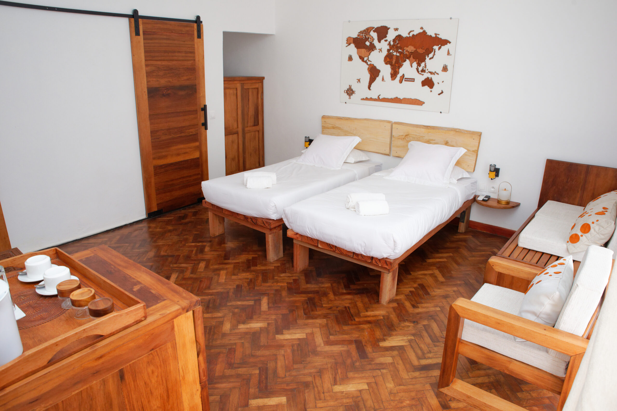 Pensée comme une immersion dans l’esthétique malagasy, notre résidence mêle bois nobles, fibres naturelles, couleurs terre et motifs artisanaux. Chaque chambre, décorée avec soin, allie élégance, modernité et matériaux locaux.